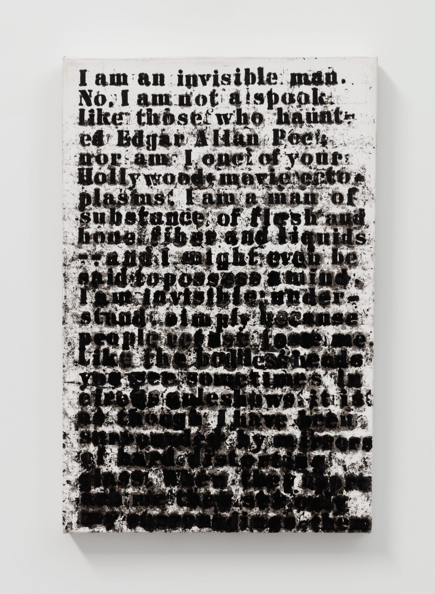 배경은 처음과 같은 흰 캔버스입니다. 그러나 그 위에 반복되는 검은 글자는, 바로 그 흰 배경 때문에 ‘검다’는 사실이 더욱 도드라집니다. 흰 배경이 존재한다는 이유만으로 글자는 ‘검은 것’으로 호명됩니다. 마치 백인과의 관계 속에서만 ‘흑인’으로 가시화되고, 그 관계 안에서 끊임없이 자신을 증명해야 했던 흑인처럼요.