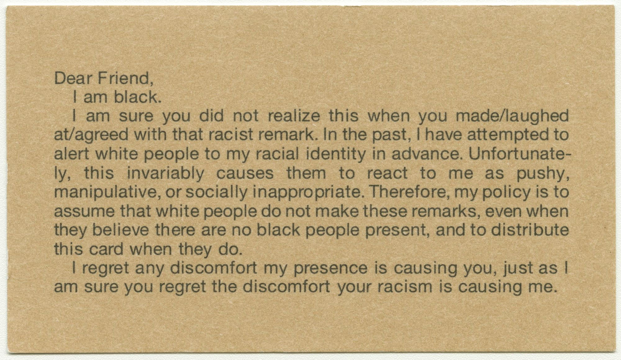 미국 작가 에이드리언 파이퍼(Adrian Piper, 1948-)는 피부색이 밝아 백인으로 오인되는 경우가 많았습다. 파티나 모임에서 누군가 무심코 인종차별적 발언을 할 때마다, 직접 반박하는 대신 문구가 적힌 카드를 건넵니다.