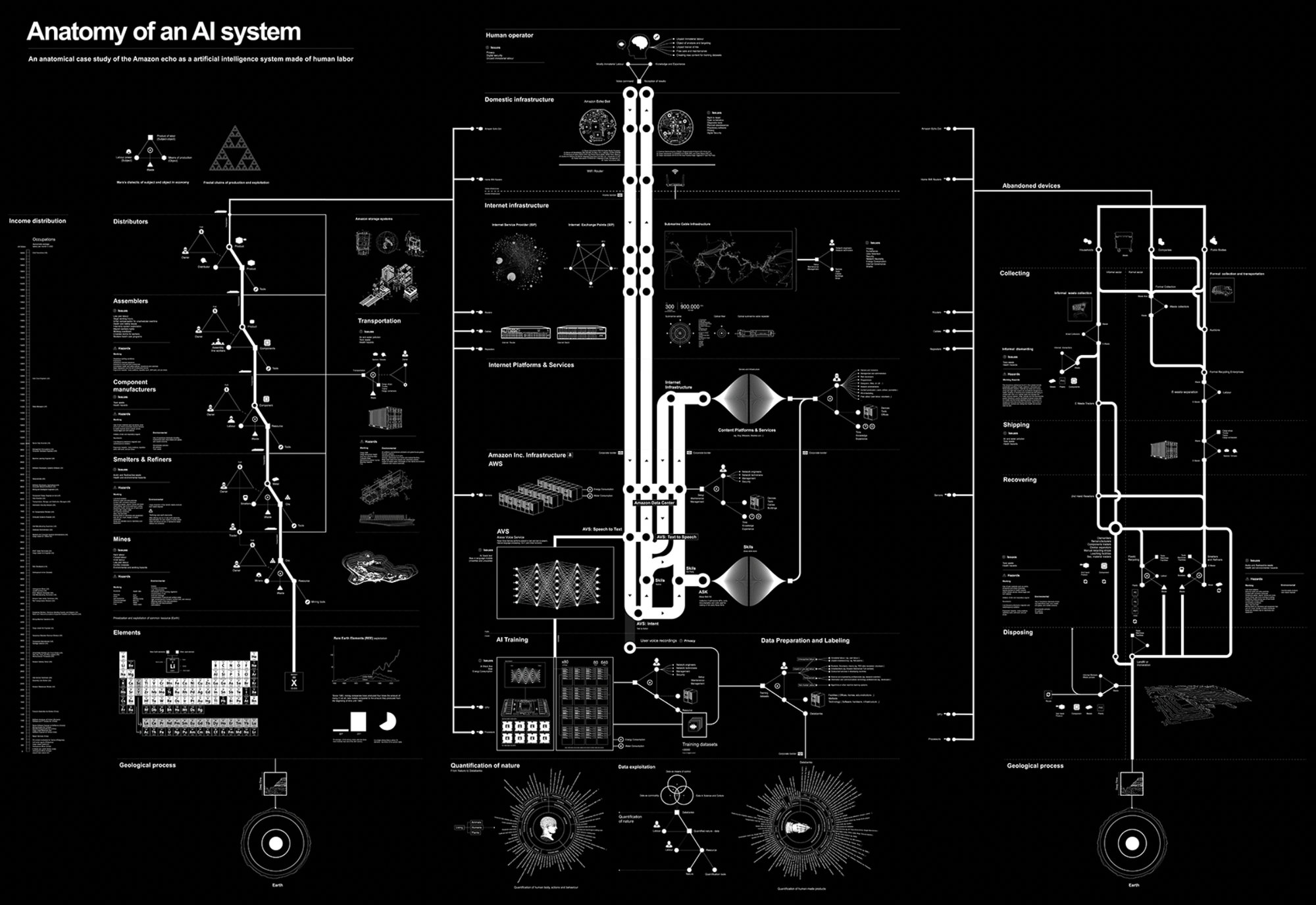 케이트 크로퍼드와 블라단 욜러는 이 보이지 않는 거대한 착취의 구조를 한 장의 지도로 펼쳐 보인다. 바로 아마존의 AI 스피커 ‘에코’의 인프라구조를 파헤친  “AI 시스템의 해부 Anatomy of an AI system”다. 이들은 단 하나의 기기를 작동시키기 위해 얼마나 많은 자원이 채굴되고, 얼마나 많은 노동자가 동원되는지 그 전체 시스템을 가시화한다. 우리가 편리하게 소비하는 기술이 실상은 지구의 자원을 바닥내고 인간을 부품화하는 ‘추출주의’의 산물임을 증명하기 위해, 사각지대에 감춰진 전체적인 시스템을 ‘사이버 탐정’이 되어 정밀하게 해부한 것이다.