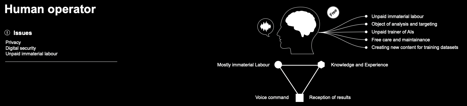 반면, “AI 시스템의 해부도”를 위에서 아래의 방향으로 읽으면 인간의 이야기가 시작된다. 메자드라와 닐슨이 노동이 추출주의의 핵심이라고 지적하듯이6, 이 거대한 시스템을 지탱하는 것은 실존하는 인간의 신체와 노동이다. AI 기술 제작에 필요한 디지털 노동의 범위는 광대하다. 광물을 채굴하는 광산의 노동자부터, 중국 공장의 엄격한 통제와 감시 하에 일하는 하드웨어 제조 및 조립 노동자, AI가 학습할 수 있도록 데이터를 가공하는 개발 도상국의 데이터 라벨러, 그리고 유독한 폐기물을 처리하는 육체 노동자까지, 전 지구 곳곳에서 막대한 인력이 투입된다.