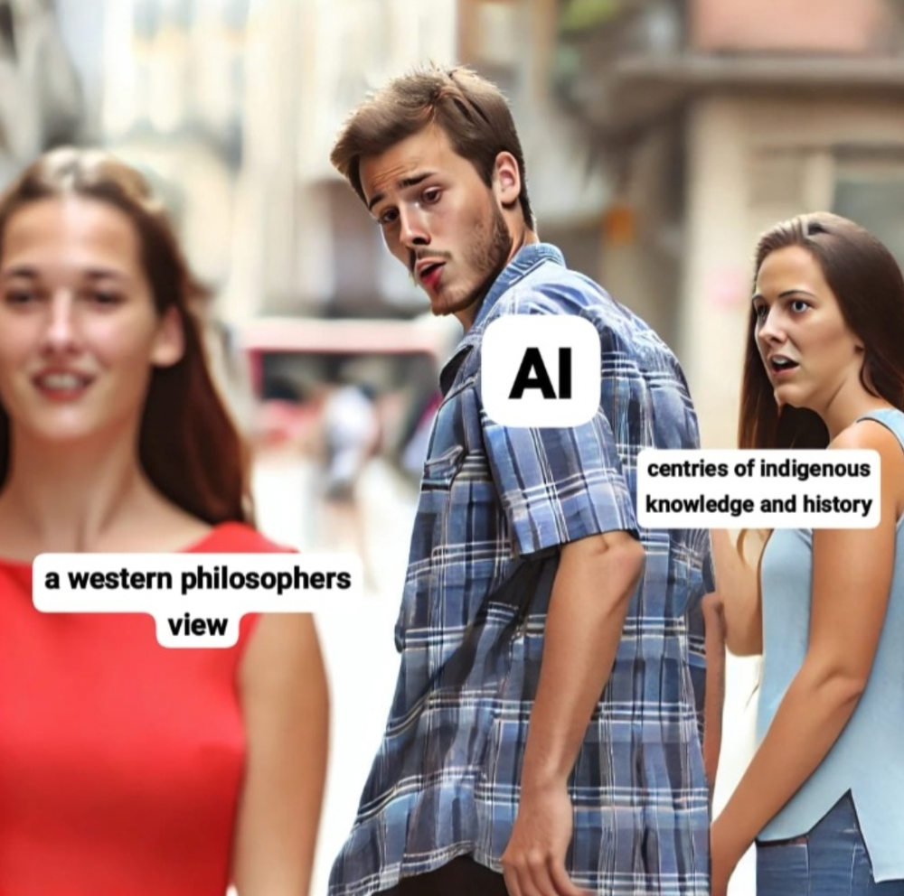 이미지 출처: Uncomfortable. Kaveer Padayachee, AI가 생성한 유명한 밈 위에 AI의 편견을 꼬집는 맥락을 추가했다.