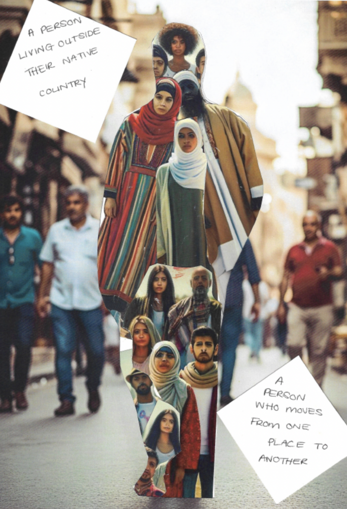 이미지 출처: Uncomfortable. 익명의 참가자, AI가 생성한 “expat (국외 거주자)” 이미지 위에 “migrant (이민자)”의 결과물을 콜라주로 합성했다.